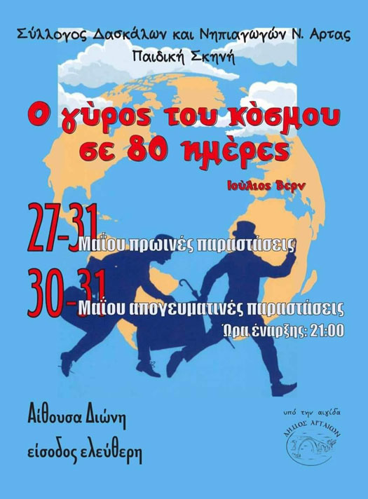 «Για μια ακόμη χρονιά ο Σύλλογος Δασκάλων και Νηπιαγωγών Άρτας πιστός στην παράδοση 28 ετών, ανεβάζει το θεατρικό έργο του Ιουλίου Βερν «Ο Γύρος του Κόσμου σε 80 ημέρες».