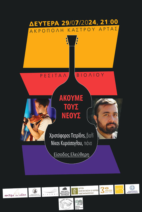Ο Δήμος Αρταίων, το Σωματείο ΔΙΑΖΩΜΑ, η Εφορεία Αρχαιοτήτων Άρτας, και το Καλογεροπούλειο Ίδρυμα Κορίνθου σας προσκαλούν σε ρεσιτάλ βιολιού στο πλαίσιο του Προγράμματος “Ακούμε τους Νέους 2024”, το οποίο υλοποιείται σε συνεργασία με το Μέγαρο Μουσικής Αθηνών και το Τρίτο Πρόγραμμα και έχει ως στόχο να συστήσει νέους μουσικούς της κλασικής μουσικής στο μελλοντικό τους κοινό.