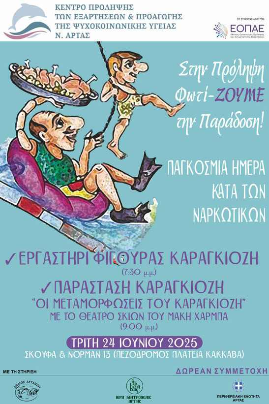 Εκδηλώσεις με θέμα τον Καραγκιόζη θα πραγματοποιήσει το Κέντρο Πρόληψης νομού Άρτας στο πλαίσιο της Παγκόσμιας Ημέρας κατά των Ναρκωτικών. Σε ανακοίνωση Τύπου που εξέδωσε και την οποία υπογράφει ο επιστημονικός υπεύθυνος, παιδοψυχίατρος, Θεόδωρος Οικονομίδης, αναφέρονται τα εξής: