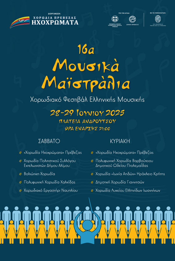 Το Σάββατο 28 και Κυριακή 29 Ιουνίου 2025 η «ΧΟΡΩΔΙΑ ΗΧΟΧΡΩΜΑΤΑ» ΠΡΕΒΕΖΑΣ διοργανώνει το Χορωδιακό Φεστιβάλ Ελληνικής Μουσικής «16α ΜΟΥΣΙΚΑ ΜΑΙΣΤΡΑΛΙΑ». υπό την αιγίδα της Περιφέρειας Ηπείρου, του Δήμου Πρέβεζας και την υποστήριξη της Ιεράς Μητροπόλεως Νικοπόλεως και Πρεβέζης. Το φεστιβάλ φέτος θα πραγματοποιηθεί στην Πλατεία Ανδρούτσου και ξεκινάει και τις δυο ημέρες στις 9:00 μ.μ.