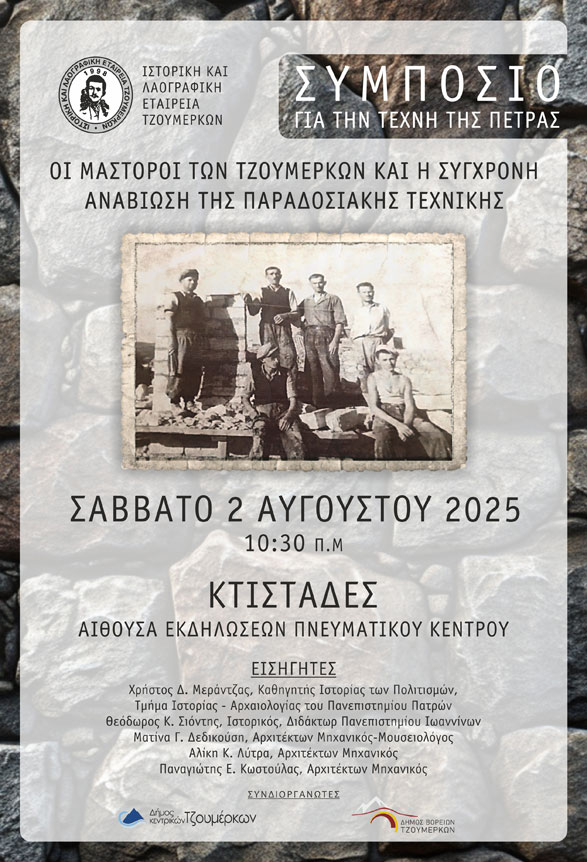 Η Πρόεδρος και τα Μέλη του Διοικητικού Συμβουλίου της Ι.Λ.Ε.Τ. σας προσκαλούν στο Συμπόσιο με θέμα: «Οι μαστόροι των Τζουμέρκων και η σύγχρονη αναβίωση της παραδοσιακής τεχνικής της πέτρας», το οποίο θα πραγματοποιηθεί το Σάββατο 2 Αυγούστου 2025, στις 10:30 π.μ., στην αίθουσα εκδηλώσεων του Πνευματικού Κέντρου στους Κτιστάδες.