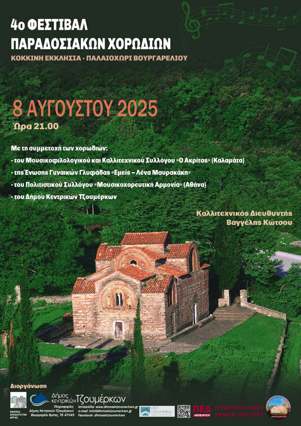 Ο Δήμος Κεντρικών Τζουμέρκων, η Εφορεία Αρχαιοτήτων Άρτας, η Περιφερειακή Ένωση Δήμων Ηπείρου και ο Πολιτιστικός Σύλλογος Παλαιοχωρίου Βουργαρελίου «Κόκκινη Εκκλησιά» διοργανώνουν με ιδιαίτερη τιμή το 4ο Φεστιβάλ Παραδοσιακών Χορωδιών. Η εκδήλωση, που έχει καθιερωθεί πλέον ως ένας θεσμός για την περιοχή, θα πραγματοποιηθεί την Παρασκευή, 8 Αυγούστου 2025 και ώρα 21.00.