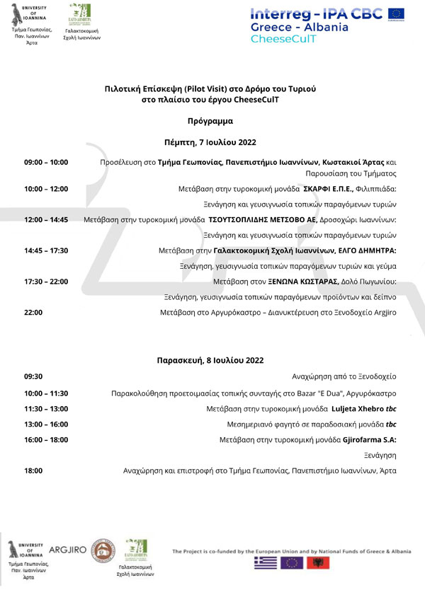 Το ταξίδι θα πραγματοποιηθεί στις 7 και 8 Ιουλίου 2022 και θα ακολουθήσει μία πρωτόλεια διαδρομή του «Δρόμου του Τυριού», με αφετηρία την Άρτα και διαδρομή μέσω Ιωαννίνων και Πωγωνίου στο Αργυρόκαστρο στην Αλβανία, με ενδιάμεσες στάσεις σε τοπικές τυροκομικές μονάδες για γευσιγνωσία τυροκομικών προϊόντων και επίσκεψη στο νεοιδρυθέν από το έργο μουσείο τυροκομίας στη Γαλακτοκομική Σχολή Ιωαννίνων.