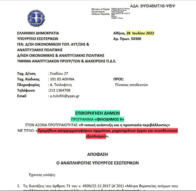 Ωστόσο, είναι σημαντικό να αποκαθίστανται τα πραγματικά δεδομένα: η χρηματοδότηση ύψους 150.000 ευρώ για το συγκεκριμένο απορριμματοφόρο είχε εξασφαλιστεί ήδη από τον Ιούλιο του 2022, στο πλαίσιο του προγράμματος “ΦΙΛΟΔΗΜΟΣ ΙΙ”, όπως αποδεικνύεται και από την επίσημη απόφαση του Υπουργείου Εσωτερικών (ΑΔΑ: 6Ψ0Ι46ΜΤΛ6-ΨΒΨ).
