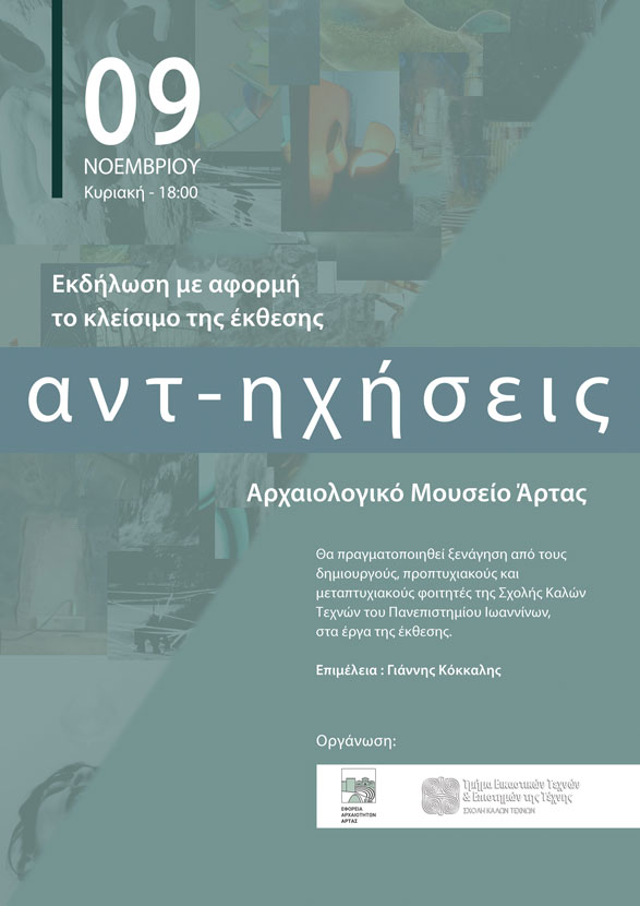 Η Εφορεία Αρχαιοτήτων Άρτας και η Σχολή Καλών Τεχνών του Πανεπιστημίου Ιωαννίνων σας προσκαλούν στο Αρχαιολογικό Μουσείο Άρτας, την Κυριακή 9 Νοεμβρίου 2025 και ώρα 6:00μ.μ., σε εκδήλωση που θα πραγματοποιηθεί με αφορμή το κλείσιμο της εικαστικής περιοδικής έκθεσης «Αντ – ηχήσεις».