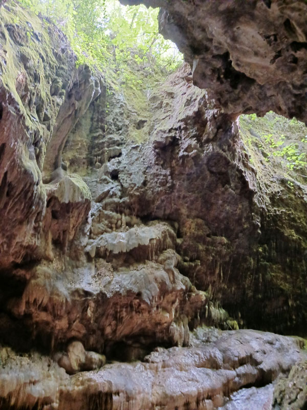 Αφού σκαρφαλώσουμε, με αρκετή δυσκολία είναι η αλήθεια, τα βράχια στην αρχή του σπηλαίου, προχωράμε στο εσωτερικό. Τα ανοίγματα της οροφής φαίνονται πολύ πιο επιβλητικά. Δεξιά, πάνω σε ένα βράχο, ένας πολύ εντυπωσιακός σχηματισμός από σταλακτίτες τραβά την προσοχή μας. Φτάνουμε στην έξοδο του σπηλαίου, που είναι πολύ πιο μικρή από την είσοδο. Το ποταμάκι περνά μέσα από το σπήλαιο. Υποθέτουμε πως από πάνω θα βρίσκεται το πέρασμα από όπου περνούσαν οι άνθρωποι. Σίγουρα δεν περιμέναμε να δούμε κάτι τόσο εντυπωσιακό. Πόσες άραγε άγνωστες ομορφιές κρύβει ακόμη ο τόπος μας; Στον δρόμο της επιστροφής, κανονίζουμε την επόμενη Κυριακή να ψάξουμε την κορυφή του Θεογέφυρου, το πέρασμα.