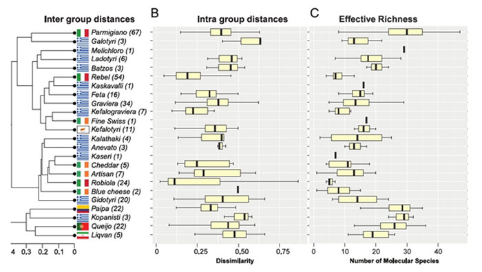 Παρατηρήθηκαν στατιστικά σημαντικές διαφορές στη βιοποικιλότητα μεταξύ των ομάδων, με την πρώτη να εμφανίζει τη μεγαλύτερη μικροβιακή ποικιλότητα. Εμβληματικές οικογένειες για την τυροκόμηση, όπως οι Lactobacillaceae και Streptococcaceae, διέφεραν σημαντικά ως προς τη σχετική τους αφθονία. Ενδιαφέρον παρουσιάζει ότι ορισμένα τυριά, όπως το κεφαλοτύρι και η παρμεζάνα, κατατάσσονται αποκλειστικά σε μία ομάδα, ενώ άλλα, όπως η φέτα και η γραβιέρα, εμφάνιζαν μικροβιακή ευελιξία και κατατάσσονται σε περισσότερες από μία. Ακόμη πιο εντυπωσιακό είναι ότι τυριά με διαφορετική υφή, γεύση και τεχνολογία παραγωγής μπορούσαν να ανήκουν στην ίδια μικροβιακή ομάδα, γεγονός που δείχνει ότι το μικροβίωμα υπερβαίνει τις κλασικές τεχνολογικές και γεωγραφικές κατηγοριοποιήσεις.