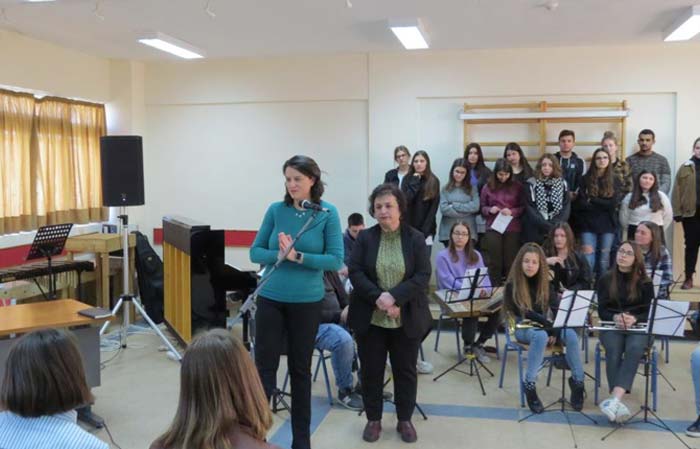Με μουσικό καλωσόρισμα υποδέχτηκε την υπουργό, μουσικό σύνολο της Β΄ Λυκείου. Η ίδια αφού πήρε το λόγο εξέφρασε το θαυμασμό της, ευχαρίστησε τους μαθητές για την υποδοχή, δήλωσε ότι δεν είναι τυχαία η επίσκεψη της στο Μουσικό Σχολείο αλλά θέλει να εκφράσει με αυτό τον τρόπο τη στήριξή της στα Μουσικά Σχολεία και πρότεινε στους μαθητές να συνομιλήσει μαζί τους για τα εκπαιδευτικά θέματα.