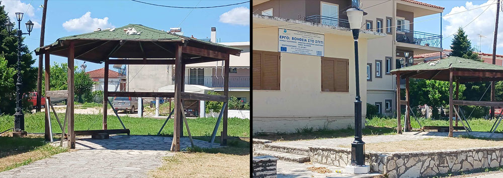 Συγκεκριμένα, η Αντιδήμαρχος της Δ.Ε. Φιλοθέης, Αγγέλα Τσώλα, ήρθε γρήγορα σε επικοινωνία με τον νέο Αντιδήμαρχο Τεχνικών Υπηρεσιών, Πολεοδομίας, Στρατηγικού Σχεδιασμού και Προγραμματισμού (Δ.Ε. Ξηροβουνίου), Λάμπρο Κοσμά, για να απομακρυνθεί άμεσα το επικίνδυνο κιόσκι, που βρισκόταν επί χρόνια στην κεντρική πλατεία στους Χαλκιάδες της Φιλοθέης. Επί σειρά ετών, το συγκεκριμένο σάπιο κιόσκι “κοσμούσε” την πλατεία του χωριού, θέτοντας σε κίνδυνο την ασφάλεια των παιδιών που συνήθιζαν να κάθονται κάτω από αυτό και να συζητούν ή να παίζουν με τα κινητά τους. Μέσα από ρεπορτάζ είχα επισημάνει κι εγώ προσωπικά στην απερχόμενη δημοτική αρχή ότι το κιόσκι ήταν ακατάλληλο για τα νέα παιδιά που μαζεύονταν σε αυτό, καθώς τα σάπια ξύλα του και οι ογκώδεις πέτρες που είχαν πεταχτεί στη σκεπή του μπορούσαν να αποτελέσουν αιτία τραυματισμού τους. Ωστόσο τα χρόνια περνούσαν και οι δημοσιεύσεις μας έμοιαζαν σαν “φωνή βοώντος εν τη ερήμω” για την τότε δημοτική αρχή, κάτι που άλλαξε άρδην με τη νέα Δημοτική Αρχή, η οποία και Ακούει και Δρα άμεσα! Με πρωτοβουλία της Αντιδημάρχου λοιπόν απομακρύνθηκε το επικίνδυνο κιόσκι που βρισκόταν στην κεντρική πλατεία στους Χαλκιάδες Φιλοθέης, αλλάχτηκαν οι λάμπες στα φωτιστικά, όπου χρειαζόταν στο χωριό, και σε κάποια σημεία του μπήκαν νέα φωτιστικά, καθώς σε ένα μάλιστα συγκεκριμένο σημείο το φωτιστικό είχε ξηλωθεί πριν από αρκετούς μήνες από ατύχημα με τα καλώδια αρχικά να κρέμονται στο δρόμο.