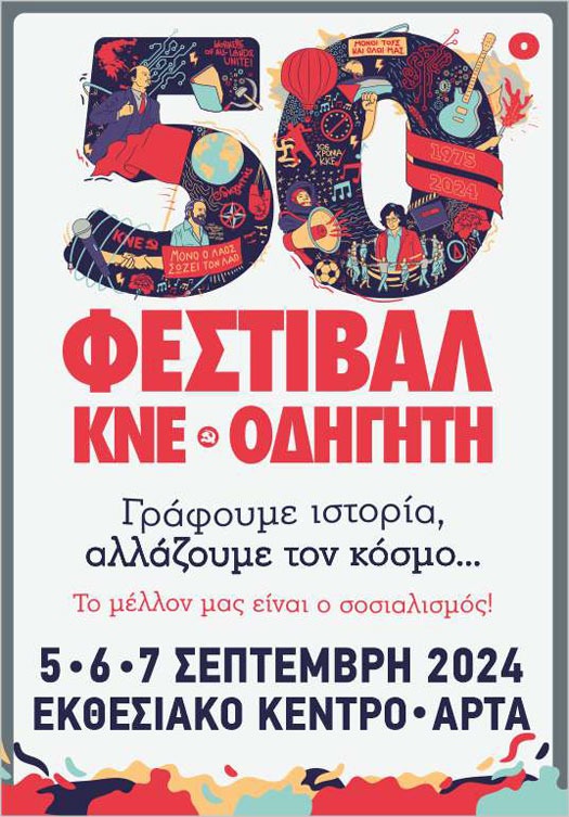 «Το Φεστιβάλ της ΚΝΕ και του “Οδηγητή” συμπληρώνει φέτος 50 χρόνια ζωής, διανύοντας έναν δρόμο μισού αιώνα, που μπορεί να μοιάζει μακρινός, αλλά δεν έχει επηρεάσει καθόλου τη ζωντάνια, τη διάθεση, τη δίψα για ακόμα περισσότερα. Ήταν τέτοια η πορεία του Φεστιβάλ στον χρόνο, που δημιούργησε το ίδιο τις συνθήκες και τις στιγμές, ώστε να το κάνει αναπόσπαστο στοιχείο της πολιτικής και της πολιτιστικής δράσης της ΚΝΕ. Γιορτάζουμε την επέτειο των 50 χρόνων του Φεστιβάλ της ΚΝΕ, χαρούμενοι και περήφανοι για όσα έχει πετύχει στη διαδρομή του, αλλά κυρίως για το ότι έχει κατορθώσει να αγκαλιαστεί από διαφορετικές γενιές και συνεχίζει να συγκινεί και τις νεότερες όσο προσελκύει χιλιάδες νέους και νέες κάθε χρόνο στις εκδηλώσεις του.