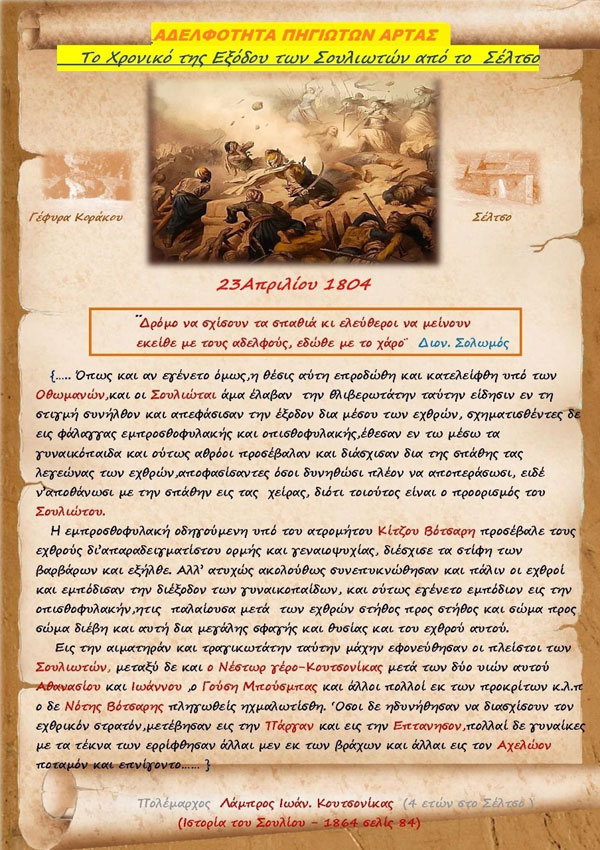 Εορτάζονται εφέτος τα ΔΙΑΚΟΣΙΑ ΕΙΚΟΣΙ χρόνια (από το 1804) της Μάχης του Σέλτσου και του Ολοκαυτώματος των Σουλιωτών που επακολούθησε. Όμως για δεκαετίες παρέμενε άγνωστη και οι μάρτυρές της Σουλιώτες ήταν οι αγνοούμενοι της Ιστορίας.