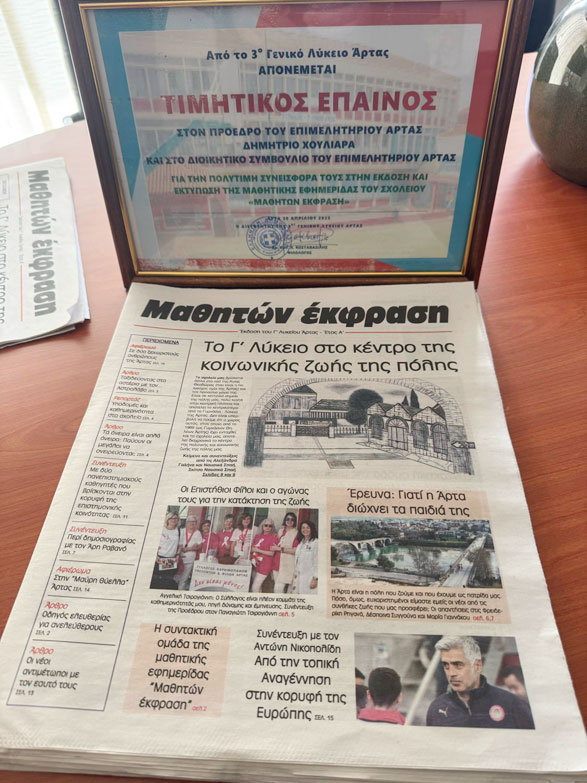 Μάλιστα, ο Διευθυντής του σχολείου, Κωνσταντίνος Κωσταβασίλης, εκ μέρους του 3ου Γενικού Λυκείου Άρτας, απένειμε τιμητικό έπαινο στον Πρόεδρο του Επιμελητηρίου Άρτας, Δημήτρη Χουλιάρα, και στο Διοικητικό Συμβούλιο του Επιμελητηρίου Άρτας για την πολύτιμη συνεισφορά τους στην έκδοση και εκτύπωση της μαθητικής εφημερίδας του σχολείου «Μαθητών έκφραση».