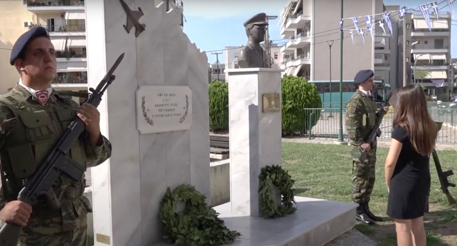 Η τελετή ξεκίνησε με επιμνημόσυνη δέηση και στη συνέχεια κατάθεση στέφανων από φορείς, εκπροσώπους ενόπλων δυνάμεων, σωμάτων ασφαλείας και την οικογένεια του Σμηναγού στο μνημείο με την προτομή του.