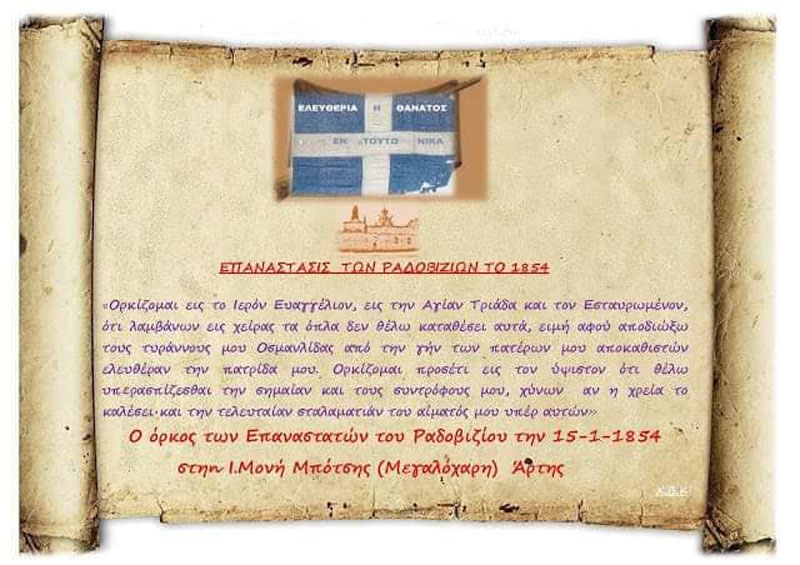 Πλήθος λαού με δύναμη 450 ένοπλων από όλα τα χωριά του Ραδοβιζίου όπως την Βρεστενίτσα (Πηγές) Σκουληκαριά, Μηγδιανά (Μηλιανά), Σεκλέστα (Ελάτη), Βρατσίστα (Καστανιά) , Μήγερης (Τετρακώμου), Σέση (Καλεντίνη), Σκουληκαριά, Βελετζικό, Σουμερού (Μεσόπυργος), Καταβόθρα (Αστροχώρι) Μπλαγκοβίτσα (Διάσελο) Κλειδί, Δημαριό και άλλα, συρρέουν στην Μπότση και εκεί στην Ι. Μονή Γεννήσεως Θεοτόκου υψώνεται το λάβαρο της Επανάστασης –Σημαία κυανή με λευκό σταυρό εντός του οποίου είναι γραμμένο "ΕΝ ΤΟΥΤΩ ΝΙΚΑ" και από κάτω -ΕΛΕΥΘΕΡΙΑ ή ΘΑΝΑΤΟΣ -Αμέσως όλοι δίνουν τον παρακάτω όρκο μέσα στο μοναστήρι κατά ομάδες.