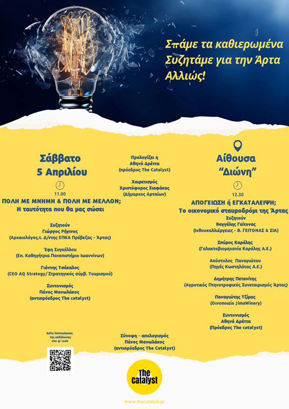 Ο Όμιλος Ιδεών «The Catalyst» διοργανώνει μια σημαντική εκδήλωση με τίτλο «Restart (?) Άρτα: Το Μέλλον Γράφεται Τώρα», αφιερωμένη στο παρόν και το μέλλον της πόλης της Άρτας. Η εκδήλωση θα πραγματοποιηθεί το Σάββατο 5 Απριλίου 2025, στις 11:00, στην Αίθουσα Διώνη.