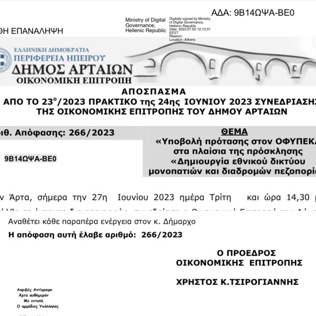 Η Απόφαση υπ’ αριθ. 266/2023 της Οικονομικής Επιτροπής του Δήμου Αρταίων, ενέκρινε την υποβολή της πρότασης στον ΟΦΥΠΕΚΑ, τις μελέτες και την αποδοχή των όρων της πρόσκλησης, ανοίγοντας τον δρόμο για την χρηματοδότηση του έργου από το Ταμείο Ανάκαμψης.