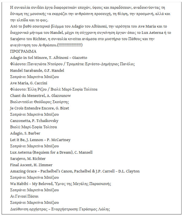Σύμφωνα με τη σχετική ανακοίνωση το πρόγραμμα που παρουσίασαν οι νεαροί μουσικοί αποτελεί ένα μουσικό ταξίδι βαθιάς συγκίνησης και πνευματικής ανάτασης, εμπνευσμένο από το κατανυκτικό κλίμα της Μεγάλης Εβδομάδας και το μήνυμα της Ανάστασης.