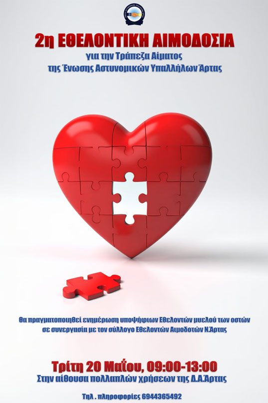Η Ένωση Αστυνομικών Υπαλλήλων Άρτας διοργανώνει εθελοντική αιμοδοσία την Τρίτη 20 Μαΐου, από τις 09:00 έως τις 13:00, στη Διεύθυνση Αστυνομίας Άρτας.