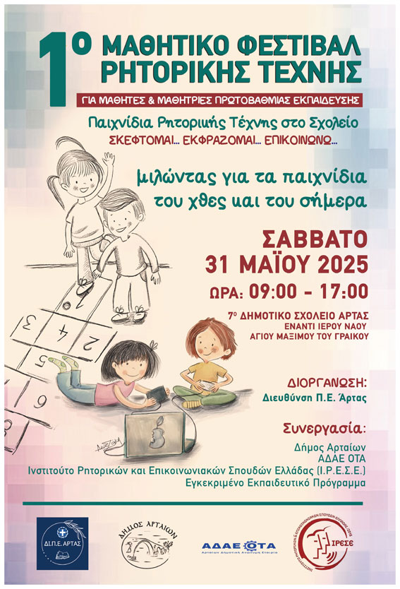 Η Διεύθυνση Πρωτοβάθμιας Εκπαίδευσης (ΔΙ.Π.Ε.) Άρτας, ο Δήμος Αρταίων, η ΑΔΑΕ ΟΤΑ και το Ινστιτούτο Ρητορικών & Επικοινωνιακών Σπουδών (ΙΡΕΣΕ), διοργανώνουν το 1Ο Μαθητικό Φεστιβάλ Ρητορικής Τέχνης, στο πλαίσιο του προγράμματος «Παιχνίδια Ρητορικής Τέχνης στο Σχολείο: Σκέφτομαι… Εκφράζομαι… Επικοινωνώ: Μιλώντας για τα παιχνίδια του χθες και του σήμερα», που θα πραγματοποιηθεί το Σάββατο 31 Μαΐου 2025 κατά τις ώρες 09:00΄ - 17:00΄, στο 7ο Δημοτικό Σχολείο Άρτας.