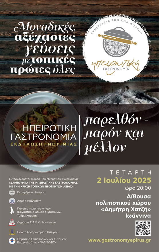 20:15 – 20:30 Ομιλητές: Αλέξανδρος Καχριμάνης, Περιφερειάρχης, ΠΕΡΙΦΕΡΕΙΑ ΗΠΕΙΡΟΥ, Νίκος Ντέμος προϊστάμενος, τμήματος "σχεδίαση e-υπηρεσιών για τον πολίτη", ΑΠΟΚΕΝΤΡΩΜΕΝΗ ΔΙΟΙΚΗΣΗ ΗΠΕΙΡΟΥ–ΔΥΤ. ΜΑΚΕΔΟΝΙΑΣ | Θέμα: ΗΠΕΙΡΩΤΙΚΗ ΓΑΣΤΡΟΝΟΜΙΑ νεοσύστατη ομαδική προσπάθεια φορέων – παρουσίαση ιστοσελίδας