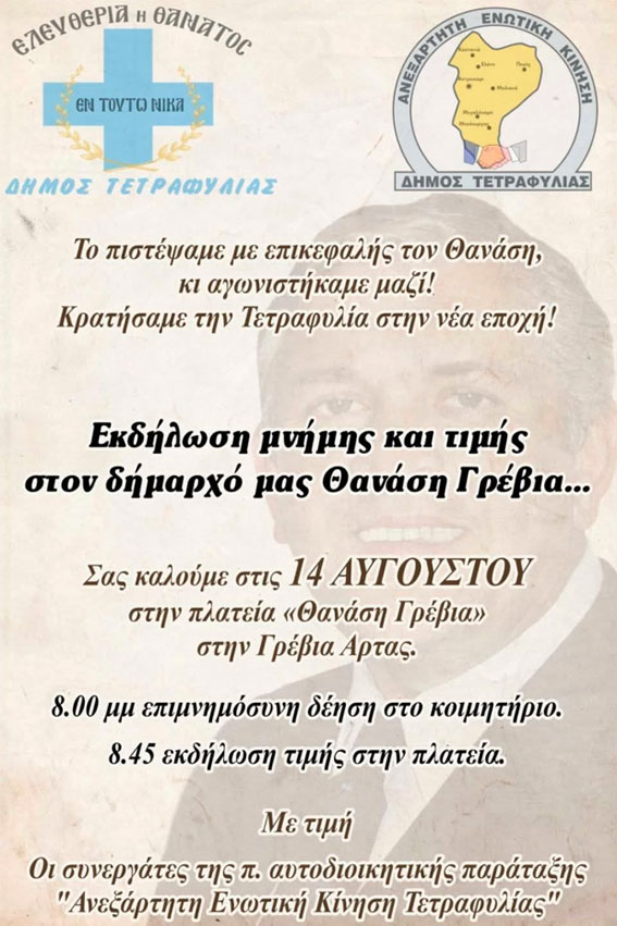 Οι αυτοδιοικητικοί συνεργάτες της «Ανεξάρτητης Ενωτικής Κίνησης Τετραφυλίας» καλούν όλους όσους τον γνώρισαν και εκτίμησαν το έργο του να συμμετάσχουν στην εκδήλωση και να τιμήσουν τη μνήμη του.
