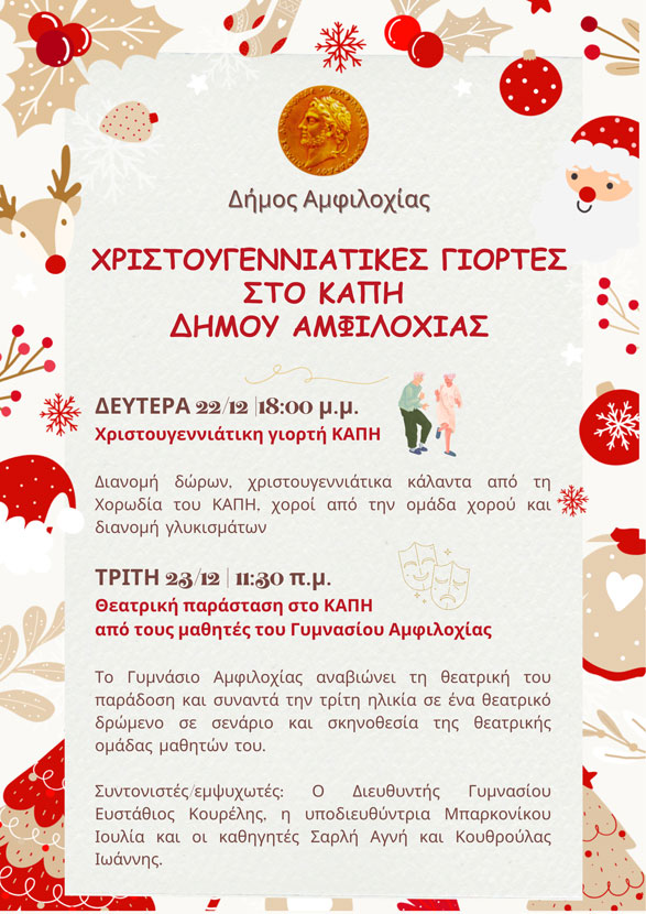 • ΤΡΙΤΗ 23/12 | 11:30 π.μ. | Θεατρική παράσταση στο ΚΑΠΗ από τους μαθητές του Γυμνασίου Αμφιλοχίας