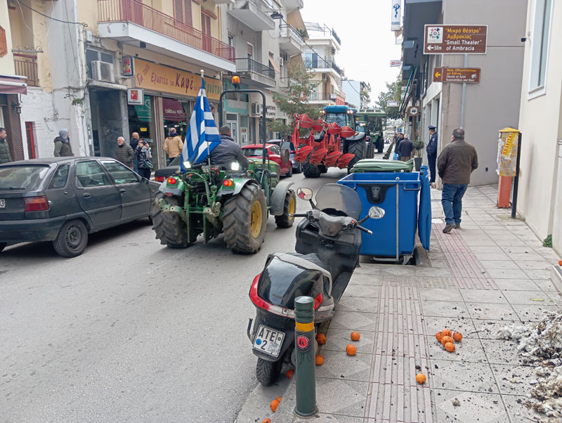 Στην πορεία τους, οι αγρότες συγκεντρώθηκαν με τα τρακτέρ τους και κινήθηκαν με πομπή στο κέντρο της Άρτας, ενώ παράλληλα έκαναν δυναμική παρέμβαση έξω από το υποκατάστημα της Τράπεζας Πειραιώς, πετώντας βαμβάκι, κοπριά, πορτοκάλια και μανταρίνια, σε μια κίνηση που συμβολίζει τα προβλήματα ρευστότητας, τις χαμηλές τιμές και τις δυσκολίες που αντιμετωπίζουν στην πώληση των προϊόντων τους.