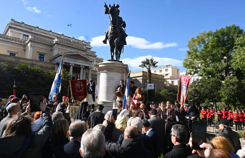 Στη συνέχεια, στις 11:15 π.μ., πραγματοποιήθηκε η μεταφορά της τελετής στον ανδριάντα του Θεόδωρου Κολοκοτρώνη στην Πλατεία Παλαιάς Βουλής (Σταδίου 13), όπου έγινε κατάθεση στεφάνων από τις συμμετέχουσες οργανώσεις. Παράλληλα, οι παρευρισκόμενοι είχαν την ευκαιρία να παρακολουθήσουν Κολοκοτρωνέικα δημοτικά τραγούδια και παραδοσιακούς χορούς, υπό την συνοδεία της Φιλαρμονικής Ορχήστρας Δήμου Αθηναίων, αντιπροσωπειών πολιτιστικών και λαογραφικών σωματείων με παραδοσιακές φορεσιές, καθώς και του Ομίλου λαϊκών μουσικών οργάνων της εποχής του Αγώνα.