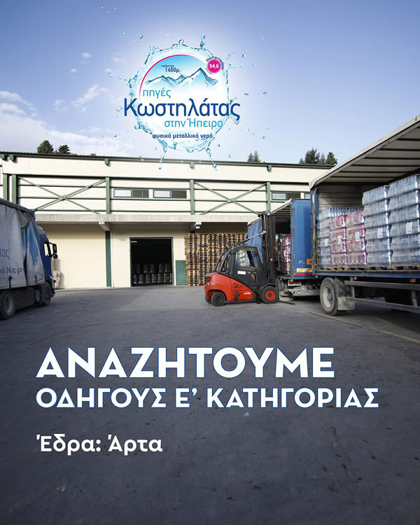 Η ΒΙΟΜΗΧΑΝΙΑ Εμφιαλώσεων Φυσικού Μεταλλικού νερού, Πηγές Κωστηλάτας Α.Ε, στο πλαίσιο ανάπτυξης του Ανθρώπινου Δυναμικού της, επιθυμεί να προσλάβει Οδηγούς με Δίπλωμα Ε' Κατηγορίας για εργασία με έδρα την Άρτα.