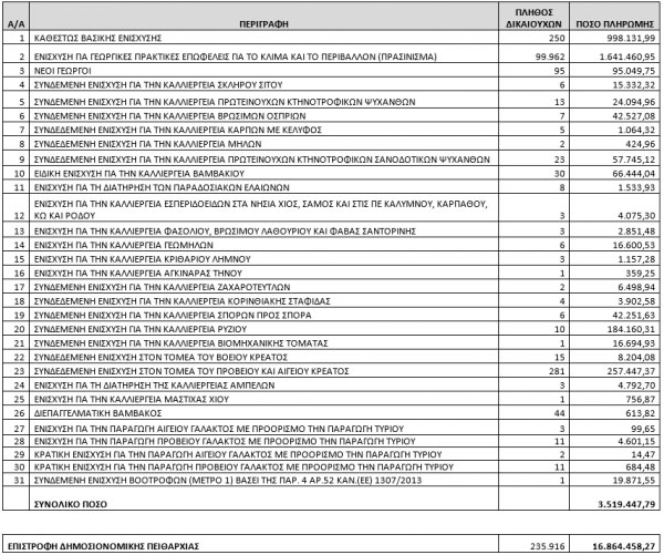 Συνολικά 20,3 εκατ. ευρώ καταβάλει σήμερα ο Ο.Π.Ε.Κ.Ε.Π.Ε., σε δικαιούχους για τα καθεστώτα των άμεσων ενισχύσεων και των ενισχύσεων μικρών νησιών του Αιγαίου και για επιστροφή της δημοσιονομικής πειθαρχίας.