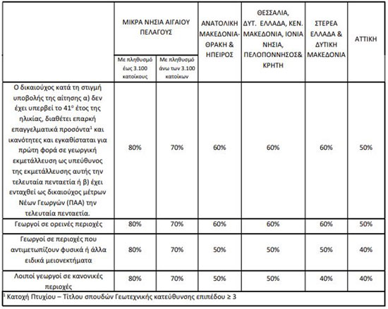 Το ποσοστό επιδότησης για τους νέους αγρότες ανέρχεται έως και το 80% για τα μικρά νησιά Αιγαίου Πελάγους , στο 50% για την Αττική και στο 60% για την υπόλοιπη χώρα.