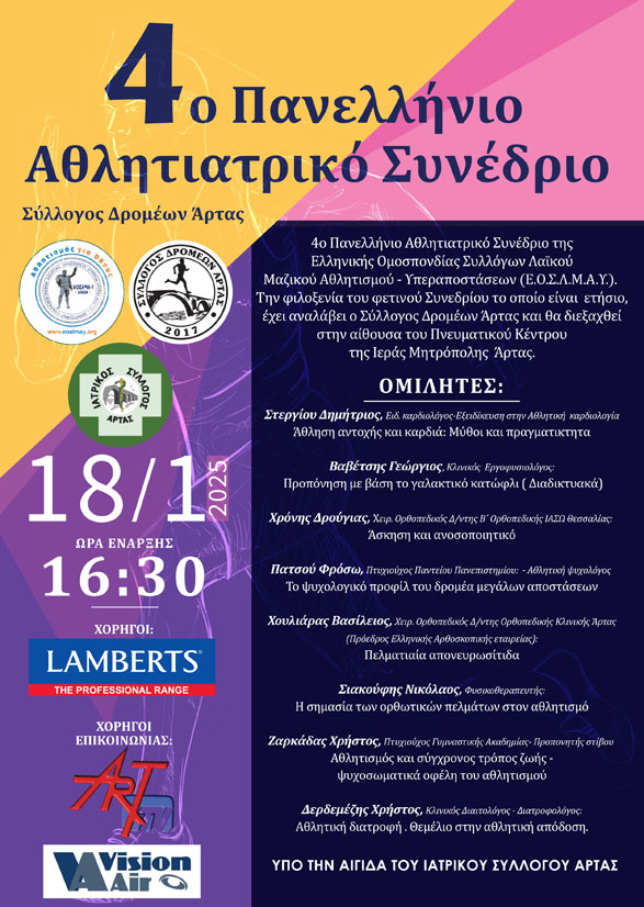 Ο Σύλλογος Δρομέων Άρτας σε συνεργασία με την Ελληνική Ομοσπονδία Συλλόγων Λαϊκού Μαζικού Αθλητισμού Υπεραποστάσεων (ΕΟΣΛΜΑΥ) διοργανώνει το 4ο πανελλήνιο αθλητιατρικό συνέδριο.