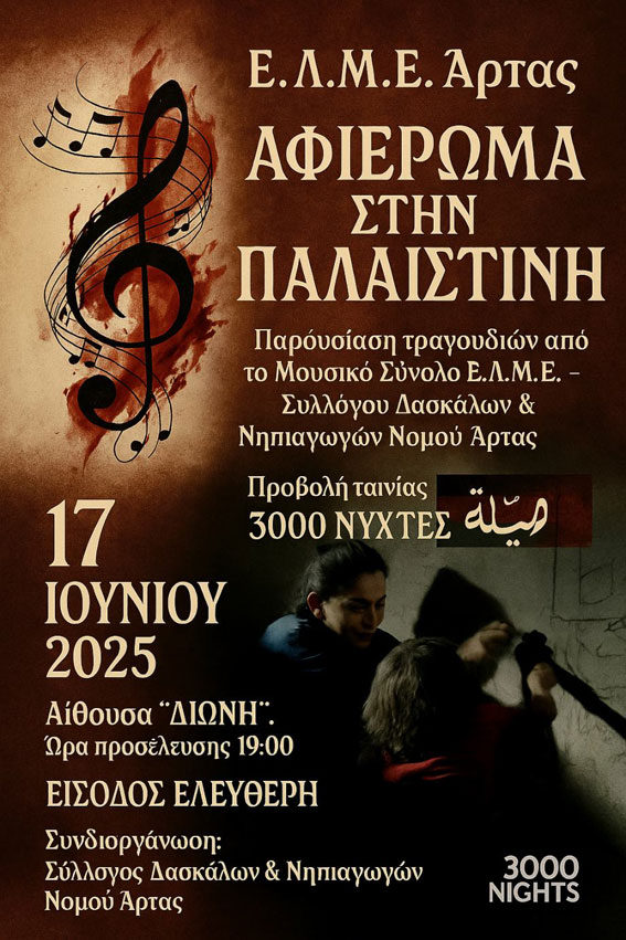 Την Τρίτη 17-06-2025 και ώρα 19.00 στην αίθουσα «ΔΙΩΝΗ», η ΕΛΜΕ Άρτας με τη συνεργασία του Συλλόγου Δασκάλων και Νηπιαγωγών Νομού Άρτας, πραγματοποιεί αφιέρωμα στην Παλαιστίνη με την προβολή της ταινίας «3000 ΝΥΧΤΕΣ».