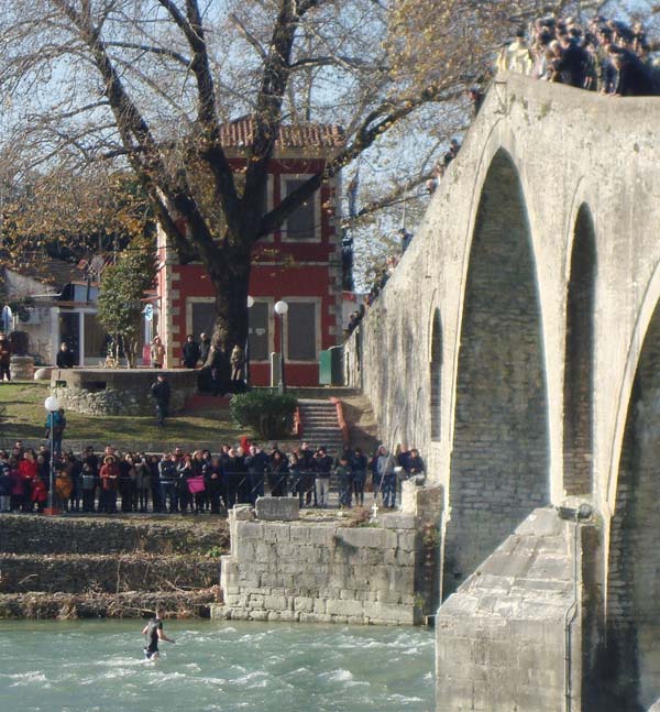 Το πρωί τελέστηκε η Ακολουθία του Μεγάλου Αγιασμού των Υδάτων στον Ιερό Ναό του Αγίου Μαξίμου Γραικού και στη συνέχεια, πραγματοποιήθηκε πομπή μέσω της οδού Θειακογιάννη, η οποία κατέληξε στο Ιστορικό Γεφύρι της Άρτας, όπου πραγματοποιήθηκε από το Σεβασμιώτατο Μητροπολίτη Άρτης κ. Καλλίνικο η κατάδυση του Τιμίου Σταυρού στα ύδατα του Αράχθου ποταμού. Στα παγωμένα νερά του Αράχθου έπεσε ο εικοσάχρονος Αρτινός, Γεράσιμος Διβάρης, φοιτητής Νομικής, ο οποίος κατά το έθιμο, βούτηξε για να πιάσει το Σταυρό. Στο μήνυμά του για τη σημερινή άγια ημέρα, ο Μητροπολίτης Άρτης έδωσε την ευχή σε όλους να πορεύονται έχοντας μέσα στην καρδιά τους το πνεύμα του Θεού, το πνεύμα της ειρήνης, ώστε με τον τρόπο αυτό να δοξάζουμε το όνομα του Ιησού Χριστού σε έναν κόσμο που θα είναι ειρηνικός, σε έναν κόσμο όπου θα βασιλεύει αυτή η γαλήνη την οποία έφερε ο Χριστός στον κόσμο με τον ερχομό Του.