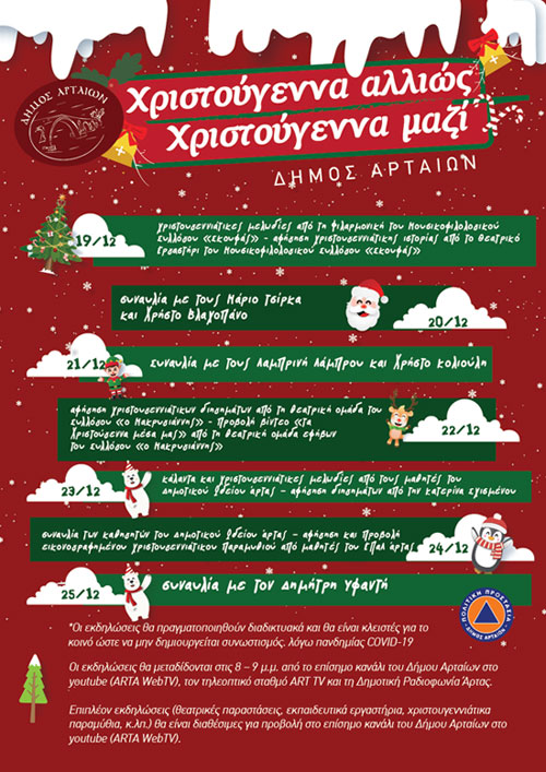 Επιπλέον μέσω του διαδικτυακού καναλιού του Δήμου Αρταίων στο ΥouTube, ARTA WebTV (www.youtube.com/artawebtv), θα προβάλλονται έξτρα γιορτινές προτάσεις, από μουσικές συναυλίες, χριστουγεννιάτικες κατασκευές, χορωδίες χριστουγεννιάτικα κάλαντα, παραμύθια μέχρι θεατρικά έργα, που σίγουρα θα μας βάλουν σε χριστουγεννιάτικο κλίμα και θα μας κρατήσουν απασχολημένους και γεμάτους χαρούμενα συναισθήματα. Οι προβολές θα μεταδίδονται παράλληλα και από τον τοπικό τηλεοπτικό σταθμό Art tv και το Δημοτικό Ραδιόφωνο «Αμβρακία fm 91.9».