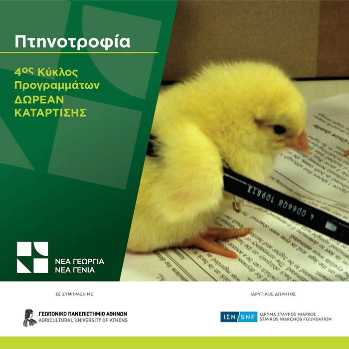 O Οργανισμός «Νέα Γεωργία Νέα Γενιά», σε συνεργασία με το Γεωπονικό Πανεπιστήμιο Αθηνών (ΓΠΑ) προσφέρουν δωρεάν πρόγραμμα κατάρτισης και συμβουλευτικής με θέμα «Κρεοπαραγωγός Πτηνοτροφία». Το πρόγραμμα υποστηρίζεται μέσω της ιδρυτικής δωρεάς του Ιδρύματος Σταύρος Νιάρχος (ΙΣΝ).