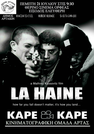 Η πρώτη προβολή θα γίνει την προσεχή Πέμπτη 21 Ιουλίου και ώρα 21:30 με την συνεργασία της Κινηματογραφικής Ομάδας Άρτας ΚΑΡΕ-ΚΑΡΕ και πρόκειται για την γαλλική ταινία «La Haine (Το Μίσος, 1995)». Η είσοδος είναι ελεύθερη.