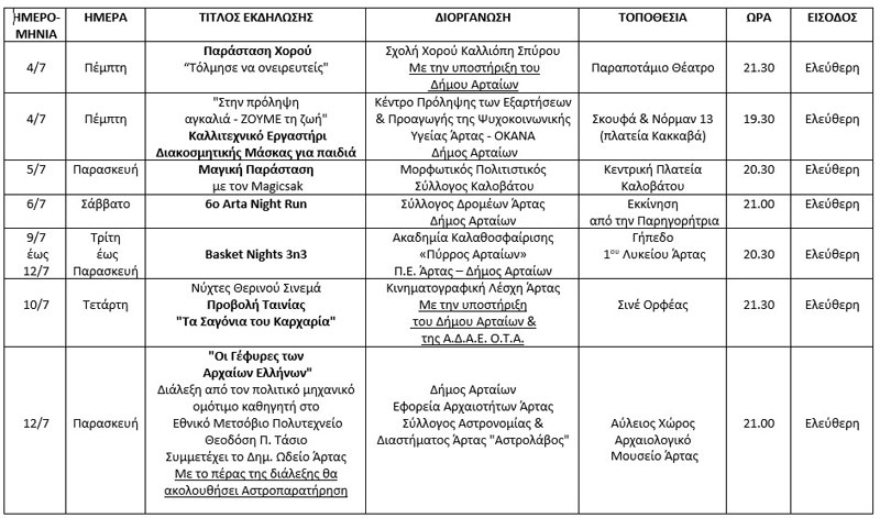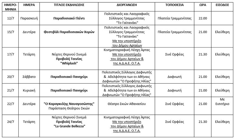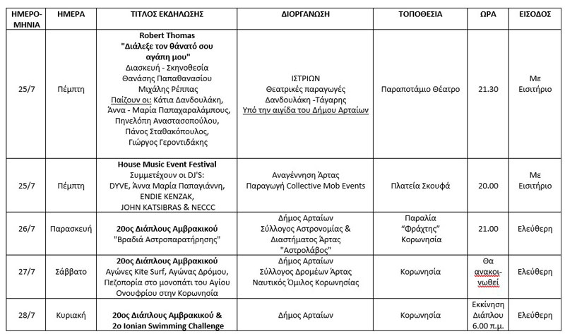 Παράλληλα, διεξάγεται ο 20ς Διάπλους Αμβρακικού με πλήθος εκδηλώσεων και δράσεων στην Κορωνησία, η 2η Εκπτωτική Νύχτα με συναυλία με τον Δήμο Αναστασιάδη και την Emily, που είναι μια διοργάνωση του Δήμου Αρταίων και του Εμπορικού Συλλόγου Άρτας, HouseMusicEvent, Festival από την «Αναγέννηση» Άρτας και διαλέξεις στον αύλειο χώρο του Αρχαιολογικού Μουσείου.