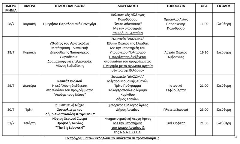 • «Πλούτος» του Αριστοφάνη - Κυριακή28Ιουλίου: Η κλασική κωμωδία του Αριστοφάνη, που διερευνά την κοινωνική ανισότητα και τη διανομή του πλούτου, θα παρουσιαστεί σε μια νέα προσέγγιση από το Εθνικό Θέατρο, στο Αρχαίο Θέατρο Αμβρακίας. Το έργο, που εντάσσεται στο πρόγραμμα «Γνωριμία με τα άγνωστα αρχαία θέατρα της Ελλάδας», θα προσφέρει στους θεατές μια μοναδική εμπειρία σε ένα αρχαίο και αυθεντικό σκηνικό.