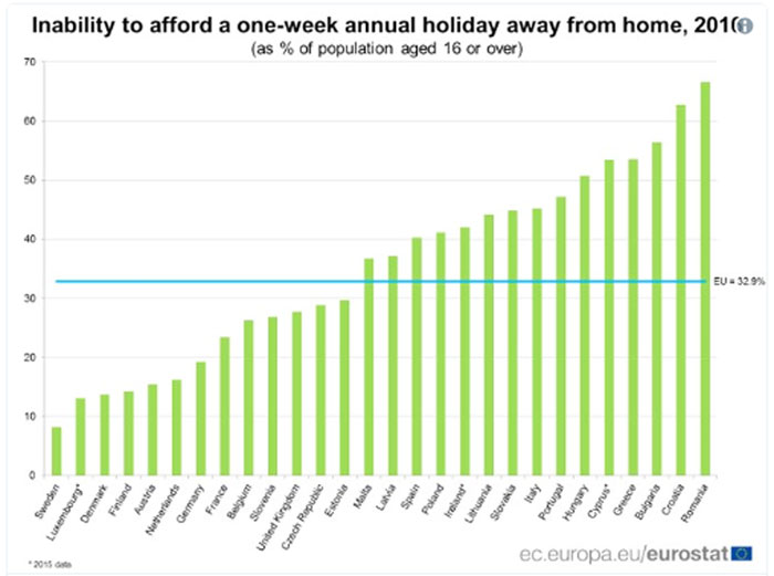Οπως φαίνεται και στο παρακάτω γράφημα της Eurostat tο 33% των νοικοκυριών σε κράτη - μέλη της Ευρωπαϊκής Ένωσης δυσκολεύονται να πληρώσουν ένα επταήμερο ταξίδι.
