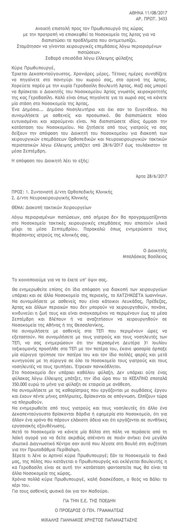 Ανοιχτή επιστολή στον Αλέξη Τσίπρα για τα προβλήματα που αντιμετωπίζει το νοσοκομείο της Άρτας, τόπος καταγωγής του πρωθυπουργού, έστειλε η ΠΟΕΔΗΝ, ενημερώνοντας τον ότι έχουν διακοπεί όλα τα τακτικά χειρουργεία λόγω έλλειψης πιστώσεων, ενώ καταγγέλλει τη διακοπή των τακτικών χειρουργείων και στο νοσοκομείο «Χατζηκώστα».