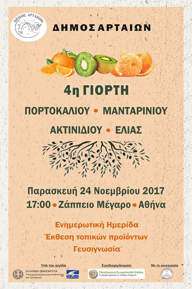 Στην Αθήνα και συγκεκριμένα στο Ζάππειο Μέγαρο θα πραγματοποιηθεί φέτος την Παρασκευή 24 Νοεμβρίου, για πρώτη φορά, η 4η Γιορτή Πορτοκαλιού-Μανταρινιού-Ακτινιδίου-Ελιάς. Στόχος είναι η γνωριμία του κοινού της πρωτεύουσας με τα χαρακτηριστικότερα προϊόντα του κάμπου της Άρτας, καθώς και η προβολή, τόσο των προϊόντων, όσο και της ίδιας της Άρτας στο Αθηναϊκό κοινό.