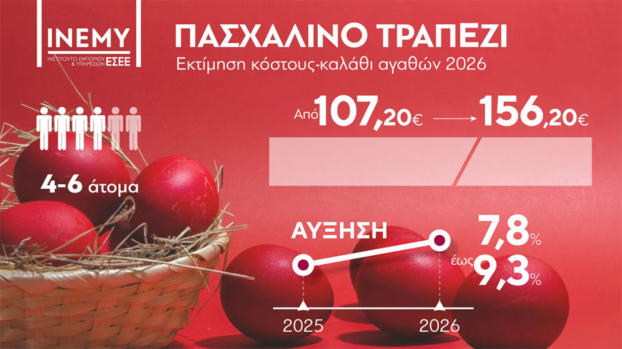 «Το Ινστιτούτο της ΕΣΕΕ αποτυπώνει και φέτος τις τιμές των προϊόντων του πασχαλινού τραπεζιού, εν μέσω έντονης διεθνούς αβεβαιότητας. Οι τιμές των τροφίμων για το πασχαλινό τραπέζι κινούνται για άλλη μία χρονιά ανοδικά, επιβαρύνοντας τα νοικοκυριά και τις περιορίζοντας τις δαπάνες για άλλα αγαθά. Η σημαντική αύξηση του φετινού πασχαλινού τραπεζιού οφείλεται: α) Στη διόγκωση του κόστους παραγωγής και μεταφοράς εξαιτίας της ανόδου των τιμών ενέργειας, β) στις ασθένειες που έπληξαν το ζωικό κεφάλαιο και γ) στο γεγονός ότι φέτος ορθόδοξο και καθολικό Πάσχα διαφέρουν μόνο κατά μία εβδομάδα, εξέλιξη που ενισχύει τη ζήτηση σε συγκεκριμένο χρονικό διάστημα. Οι τιμές στα σοκολατένια αυγά παρέμειναν στα ίδια περίπου με τα περυσινά επίπεδα, ενώ υπενθυμίζεται πως το 2025 είχε σημειωθεί ισχυρή αύξηση εξαιτίας της διόγκωσης της τιμής του κακάο. Σε κάθε περίπτωση, το μειωμένο διαθέσιμο εισόδημα κατευθύνεται περισσότερο στην κάλυψη των απαραίτητων αγαθών για το πασχαλινό τραπέζι μειώνοντας τις αυθόρμητες αγορές σε μία περίοδο που η παράταση των γεωπολιτικών εντάσεων προκαλεί προβληματισμό στην αγορά, αν και πέραν των τροφίμων και των καυσίμων δεν καταγράφονται, έως τώρα, ανατιμήσεις στα υπόλοιπα προϊόντα».