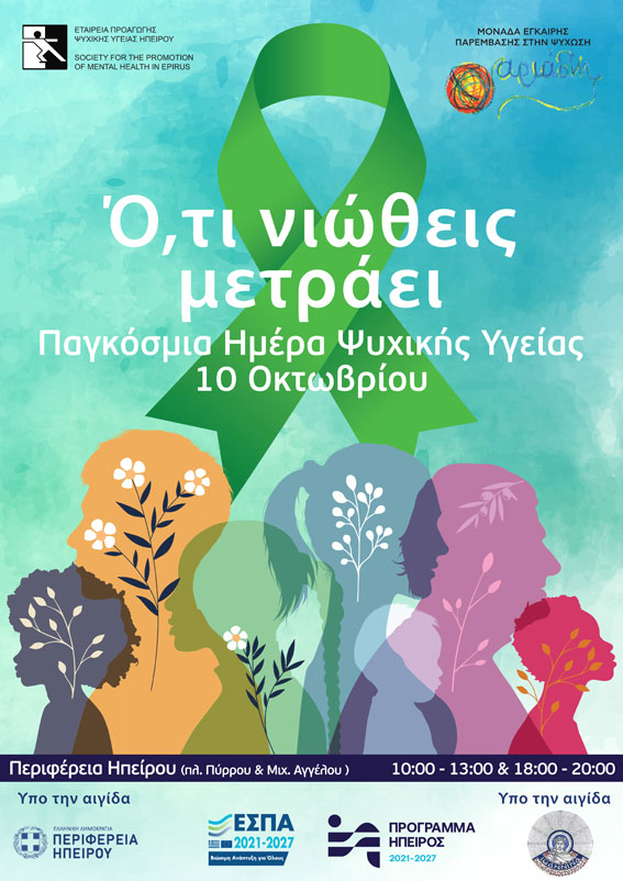 Με αφορμή την 10η Οκτωβρίου – Παγκόσμια Ημέρα Ψυχικής Υγείας, η Μονάδα Έγκαιρης Παρέμβασης στην Ψύχωση (ΜΕΠΨ) «Αριάδνη» της Εταιρείας Προαγωγής Ψυχικής Υγείας Ηπείρου (Ε.ΠΡΟ.Ψ.Υ.Η.) διοργανώνει μια κοινοτική δράση με τίτλο «Ό,τι νιώθεις μετράει!», με στόχο την ενημέρωση, την πρόληψη και την ευαισθητοποίηση γύρω από τα ζητήματα ψυχικής υγείας.