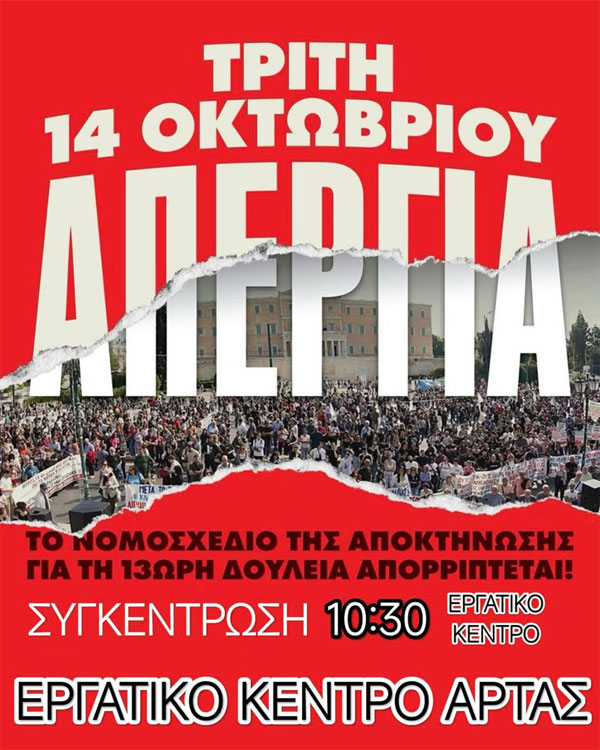 Ούτε λεπτό χαμένο! Ξεσηκωμός τώρα σε κάθε χώρο δουλειάς και κλάδο ενάντια στο νομοσχέδιο - έκτρωμα της εργασιακής εξόντωσης, της «ευελιξίας» δίχως όρια, της 13ωρης δουλειάς - σκλαβιάς. Το αγωνιστικό αυτό κάλεσμα φτάνει ήδη πλατιά στην εργατική τάξη, μπροστά στη νέα πανεργατική απεργία της Τρίτης 14 Οκτώβρη, μέρα που η κυβέρνηση φέρνει προς ψήφιση στην Ολομέλεια το νομοσχέδιο.