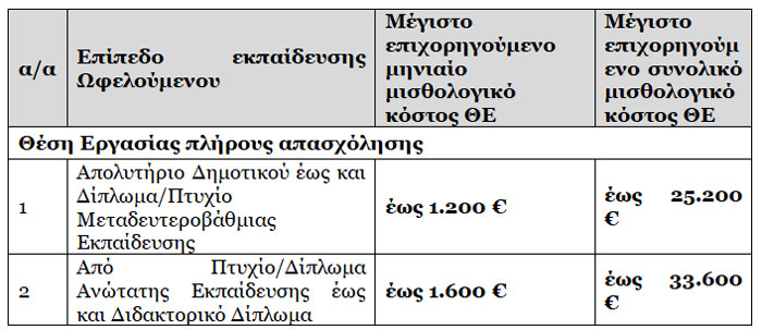 Το μέγιστο επιλέξιμο κόστος ανά ανθρωπομήνα, ανάλογα με το εκπαιδευτικό επίπεδο του ωφελούμενου (το αντίστοιχο για ανθρωπομήνα μερικής απασχόλησης διαμορφώνεται αναλογικά) διατυπώνεται στον κάτωθι πίνακα: