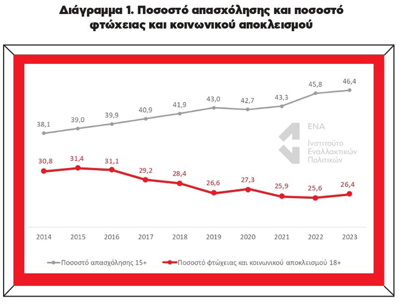- Από το 2019 μέχρι το 2023 το ποσοστό απασχόλησης αυξήθηκε κατά 3,4 μονάδες (στο 46,4%) αλλά το ποσοστό φτώχειας και κοινωνικού αποκλεισμού μειώθηκε κατά μόλις 0,2 μονάδες (στο 26,4%).