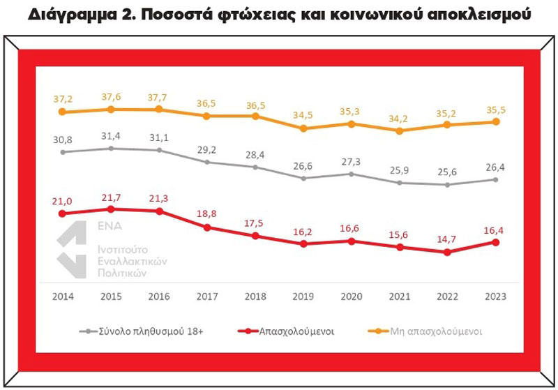 Το τρίτο στοιχείο είναι η εξέλιξη του ποσοστού φτώχειας και κοινωνικού αποκλεισμού των μη απασχολούμενων που μειώθηκε κατά 2,7 μονάδες μεταξύ 2014 και 2019 (από 37,2% σε 34,5%) αλλά αυξήθηκε κατά 1 μονάδα μεταξύ 2019 και 2023 (στο 35,5%).